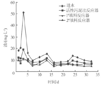 由圖 3 可以看出,與生物接觸氧化法相比,傳統(tǒng)活性污泥法的油類出水濃度受進水影響較大,說明生物接觸氧化法對于油類的抗沖擊負荷能力強于傳統(tǒng)活性污泥法;由于填料的吸附作用,實驗初期,生物接觸氧化法出水中油的質(zhì)量濃度可以維持較低的水平(10 mg/L),明顯優(yōu)于傳統(tǒng)活性污泥法(20 mg/L);實驗中期投加不同填料的反應(yīng)器的出水中油的質(zhì)量濃度沒有明顯差異; 活性污泥法處理效果略差于接觸氧化法;反應(yīng)19 d 左右時,投加填料的反應(yīng)器出水中的質(zhì)量濃度趨向平緩,基本維持在10 mg/L 以下,優(yōu)于傳統(tǒng)活性污泥法。從整體來看,投加 2# 填料的反應(yīng)器的出水中油的質(zhì)量濃度略優(yōu)于投加 1# 填料的反應(yīng)器,但無明顯差別,可見填料種類對油類的去除效果影響較小。