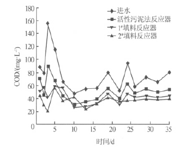 由圖 4 可知,實驗初期進水COD 波動較大,傳統(tǒng)活性污泥法出水COD 受到很大影響( 40 ~80 mg/L),而生物接觸氧化法仍可維持較穩(wěn)定的出水 COD(20~50 mg/L),可見處理初期填料對COD 同樣有較強的吸附作用。處理7~10 d 左右,生物接觸氧化法出水COD 波動較大,可能由于填料的初期吸附作用已經(jīng)達到飽和所致。投加1# 填料、2# 填料的反應(yīng)器分別在處理26、20 d 左右出水COD 趨于穩(wěn)定,且受進水波動影響較小。投加2# 填料的反應(yīng)器在生物膜基本成熟后其出水COD 略低于投加1# 填料的反應(yīng)器,但無明顯差別,可見填料種類對COD 的去除效果影響較小。