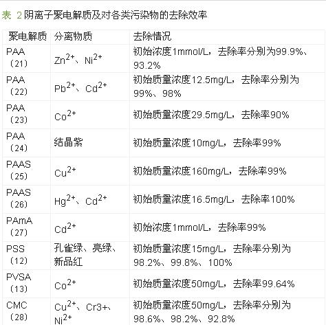 陰離子聚電解質(zhì)是指在水中離解后聚合物骨架帶負(fù)電荷的聚電解質(zhì)。與陽離子聚電解質(zhì)相比,陰離子聚電解質(zhì)使用的范圍較窄,主要用來去除金屬陽離子及陽離子染料。PEUF 中使用最廣泛的陰離子聚電解質(zhì)為聚丙烯酸(PAA) 〔21 -24〕及聚丙烯酸鈉(PAAS)〔25, 26〕。此外,聚丙烯酸銨(PAmA)〔27〕、聚苯乙烯磺酸鈉(PSS)〔12〕、聚乙烯磺酸(PVSA)〔13〕及羧甲基纖維素(CMC)〔28〕也被證明可以有效地去除陽離子污染物。表 2 總結(jié)了PEUF 中常用的陰離子聚電解質(zhì)及對各類污染物的去除效果。