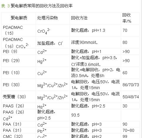 由表 3 可知,對重金屬處理中聚電解質(zhì)回收研究較多、使用最廣泛的為酸化超濾法,該方法所需 pH 非常低,受聚電解質(zhì)與金屬之間親和力影響大。 Jianxian Zeng 等〔26〕用酸化法回收絡(luò)合了Cd2+ 的 PAAS,當(dāng)pH=2.5 時(shí)回收率為93.5%,而當(dāng)PAAS 絡(luò)合的為Hg2+時(shí)聚電解質(zhì)回收率僅為30%。當(dāng)酸化超濾法和加鹽超濾法聯(lián)合使用時(shí),pH 可適當(dāng)提高,且聚電解質(zhì)的回收效果更好。J. Barron-Zambrano 等〔18〕 研究表明,當(dāng)濃縮液中加入Cl-濃度為0.6 mol/L 溶液時(shí),只需將pH 降低到3.5 就能使PEI 的回收率達(dá) 90%。R. S. Juang 等〔30〕在外加電壓為50 V,電流為 1 A 的條件下電解濃縮液回收殼聚糖,可以使86% 的Mg2+、70%的Cu2+、73%的Zn2+沉積在極板上,但電解過程中不斷有酸霧產(chǎn)生,電解結(jié)束后濃縮液變成深綠色,濃縮液中的有機(jī)物含量變?yōu)樵瓉淼?0%,證明殼聚糖在回收的過程中遭到了破壞。另外,對于酸根離子,無論是用加酸超濾法還是加鹽超濾,聚電解質(zhì)的回收率都較低,只有70%~80%〔15, 16〕,這可能與解絡(luò)后的酸根離子不能與聚電解質(zhì)有效分離有關(guān)。具體參見http://wlmqsb.com更多相關(guān)技術(shù)文檔。