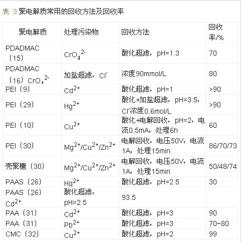 為了保證對污染物的去除率,在PEUF 中所使用的聚電解質(zhì)與污染物的濃度比遠(yuǎn)大于1,所以聚電解質(zhì)的用量很大,連續(xù)運(yùn)行時(shí)操作成本高,且 PEUF 濃縮液中含有高濃度的聚電解質(zhì),如果不經(jīng)處理直接排放到環(huán)境中,容易造成二次污染。因此,如何有效地回收利用聚電解質(zhì),減小運(yùn)行成本并降低二次污染的危險(xiǎn)逐漸成為PEUF 技術(shù)的研究熱點(diǎn)。就目前的研究狀況來看,聚電解質(zhì)的回收方法主要有酸化超濾法、加鹽超濾法、電解回收法以及這3 種方法的組合。表 3 總結(jié)了聚電解質(zhì)常用的回收方法及回收率。