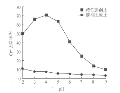 由圖 1 可知,在不同pH 條件下,改性膨潤(rùn)土對(duì)廢水溶液中Cr6+的去除率明顯優(yōu)于膨潤(rùn)土原土,并隨著pH 的增大而增大。當(dāng)pH=4 時(shí),改性膨潤(rùn)土對(duì) Cr6+的去除率最高,達(dá)到71.2%,此后當(dāng)pH 繼續(xù)增大去除率則減小。這主要是因?yàn)樵谒嵝越橘|(zhì)中,Cr6+主要以Cr2O72-或Cr2O42-形式存在,而且膨潤(rùn)土在酸性條件下凝聚性強(qiáng),吸附后易絮凝沉降分離; 在強(qiáng)酸中,溶液中H+濃度過(guò)大,占去膨潤(rùn)土表面吸附位,使改性膨潤(rùn)土的吸附能力受到了限制,Cr6+的去除率不是很高,隨著pH 的增加,膨潤(rùn)土端面離解出更多 OH-,使表面上的正電荷密集,利于吸附;但當(dāng)pH 繼續(xù)增加,溶液中OH-濃度過(guò)大,占去膨潤(rùn)土表面吸附位,結(jié)果對(duì)Cr6+去除能力下降,且膨潤(rùn)土在堿性條件下絮凝性下降,造成分離困難。