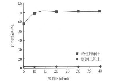 圖 2 表明,在吸附初始階段,隨著吸附時(shí)間的增加,改性膨潤(rùn)土對(duì)廢水中Cr6+的吸附容量顯著增大,對(duì)Cr6+最大去除率為71%,40 min 后基本達(dá)到吸附平衡,增加吸附時(shí)間Cr6+去除率并沒(méi)有提高。而膨潤(rùn)土原土對(duì)廢水中Cr6+的去除效果并不顯著,去除率始終維持在10%左右。