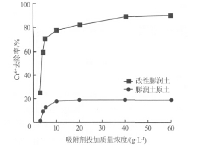 由圖 3 可以看出,開(kāi)始時(shí)隨著投加量的增加,改性膨潤(rùn)土與原土對(duì)電鍍廢水中Cr6+的去除率均有明顯提高,在相同的投加量下,改性膨潤(rùn)土對(duì) Cr6+的去除率要明顯優(yōu)于原土。當(dāng)投加質(zhì)量濃度達(dá)到40 g/L 時(shí),改性膨潤(rùn)土對(duì)Cr6+的去除率可達(dá)到 86.1%;超過(guò)40 g/L,去除率增加不明顯。原土在投加質(zhì)量濃度10 g/L 時(shí)達(dá)到最大,但對(duì)Cr6+的去除率不到20%。