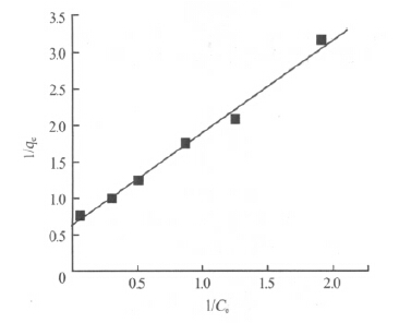 利用線(xiàn)性回歸法得到的吸附等溫方程為:1/qe= 1.264/Ce+0.626,r=0.997,可以看出改性膨潤(rùn)土對(duì)Cr6+ 的吸附符合Langmuir 吸附等溫方程,由此計(jì)算得出改性膨潤(rùn)土對(duì)Cr6+的飽和吸附量為1.60 mg/g。具體參見(jiàn)http://wlmqsb.com更多相關(guān)技術(shù)文檔。