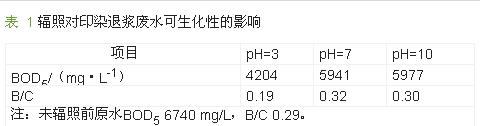 從表 1 可以看出:經(jīng)100 kGy 輻照后,不同pH 的退漿廢水B/C 變化不同,中性、堿性條件下B/C 均有不同程度的提高,酸性條件下B/C 反而下降。說(shuō)明中性、堿性條件有利于該廢水后續(xù)的生物處理。