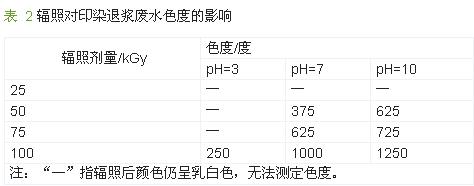 對(duì)輻照后的印染退漿廢水進(jìn)行色度的測(cè)定,結(jié)果見(jiàn)表 2。