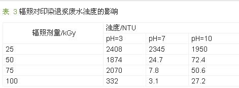 水樣經(jīng)輻照后,產(chǎn)生了分層現(xiàn)象,并且隨著輻照劑量的增加,分層現(xiàn)象逐漸明顯,特別是pH 分別為7、10 的退漿廢水經(jīng)50 kGy 以上劑量輻照后,水樣則產(chǎn)生明顯沉淀,固液分離后溶液變得清澈透明,同劑量下以中性條件下出水濁度最低。對(duì)輻照處理過(guò)的印染退漿廢水的濁度進(jìn)行了測(cè)定,結(jié)果見(jiàn)表 3。