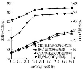 在廢水初始pH 條件下,我們分別采用ClO2氧化-光催化聯(lián)合處理法與單獨(dú)ClO2氧化法對(duì)苯胺廢水進(jìn)行處理,得到兩種處理方法的處理效果見圖 2。