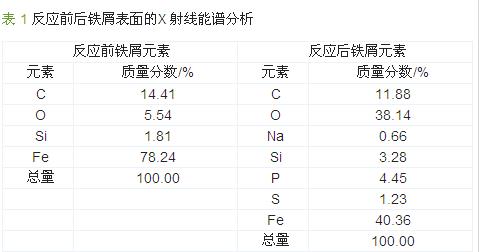 由表 1 可見,反應(yīng)后鐵元素大量減少,磷氧元素增多,這主要是由于鐵炭原電池反應(yīng)后生成Fe2+,消耗了部分鐵元素,而磷與氧以磷酸鐵或堿式磷酸鐵沉淀的形式附著在鐵屑表面。后續(xù)研究需進(jìn)一步分析鐵屑填料表面沉淀物的組分,以揭示除磷機理。具體參見http://wlmqsb.com更多相關(guān)技術(shù)文檔。
