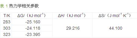 由表 1 可知:ΔG 均為負值,表明吸附過程是自發(fā)進行的,與等溫吸附特性研究結(jié)論一致,而且ΔG 隨溫度的升高呈增加趨勢;ΔH 為正值表明吸附過程本身是吸熱的,說明高溫有利于吸附的進行;ΔS 為正值,表明在吸附過程中固液界面無序,混亂度較大,可能與升溫更有利于活性炭纖維與酸性品紅發(fā)生化學(xué)吸附有關(guān)。具體參見http://wlmqsb.com更多相關(guān)技術(shù)文檔。