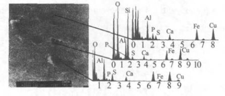 對PAFC 絮凝沉降物進行EDS 分析,發(fā)現(xiàn)其中均含有鋁、鐵,且鋁鐵比≈6∶4。這說明PAFC 絮凝劑在水中是以鋁鐵共聚物形態(tài)存在〔7〕,所有沉降物均被PAFC 的球形顆粒所包裹沉降。