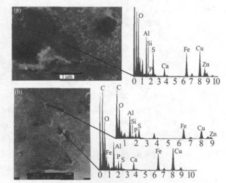 圖 4(a)表明絮凝沉降體中的條狀微生物是重金屬Zn 的富集體,圖 4(b)顯示,僅條狀微生物中含Zn 而團形物無Zn,進一步證實貴陽市城市污水中的條狀微生物對重金屬Zn 產(chǎn)生專屬吸附。由PAFC絮凝劑帶入的Zn 經(jīng)條狀微生物吸附后可沉降去除,不會造成處理后水中的重金屬Zn 增加(見表 1)。