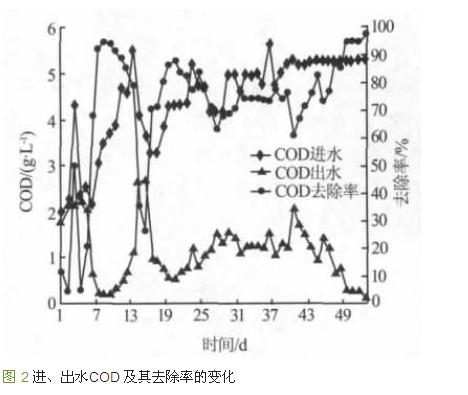 啟動期間反應器進、出水COD 及其去除率隨時間的變化見圖 2。