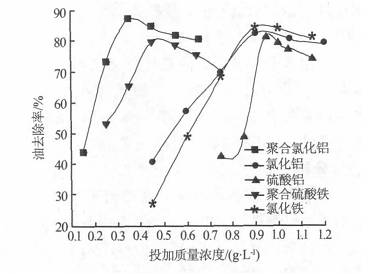 由圖1、圖2可知,隨著混凝劑投加量的增加,COD和油的去除率都隨之增大,當(dāng)混凝劑投加量達(dá)到一定值后,繼續(xù)增大投加量,COD和油的去除率不再隨之增大,這可以用混凝劑的吸附表面中和機(jī)理解釋。從圖1、圖2還可以看出,高分子無機(jī)混凝劑聚合氯化鋁和聚合硫酸鐵鐵的投加量明顯少于其他混凝劑,且處理效果優(yōu)于其他混凝劑,其中聚合氯化鋁在投加質(zhì)量濃度為0.35g/L時(shí),COD和油的去除率達(dá)到最大,分別為97.1%和86.8%;聚合硫酸鐵在投加質(zhì)量濃度為0.45g/L時(shí),COD和油的去除率達(dá)到最大,分別為97.4%和79.7%。