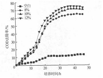 比較菌種投加量為10%和12%的數(shù)據(jù)可以看出,當(dāng)其投加量增加到一定程度后,污染物去除率的增大并不明顯,這是因?yàn)楫?dāng)微生物的初始投加量增大一定程度之后,最終可以在廢水中生長(zhǎng)的數(shù)量會(huì)達(dá)到一個(gè)最大值,此后繼續(xù)增大初始投加量,并不能繼續(xù)擴(kuò)大菌群數(shù)量。選擇12%為微生物的最佳初始投加量。