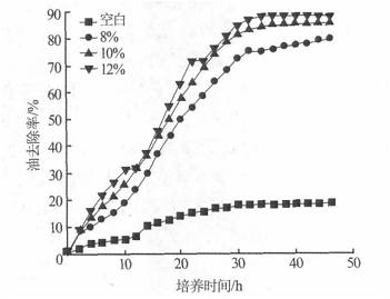 隨著培養(yǎng)時(shí)間的推移,污染物的去除率逐漸增大。其規(guī)律基本與微生物的生長(zhǎng)曲線相吻合,即前10h為微生物的適應(yīng)期,10~36h為對(duì)數(shù)增長(zhǎng)期,36h以后趨于穩(wěn)定,因此選擇36h為最佳培養(yǎng)時(shí)間。