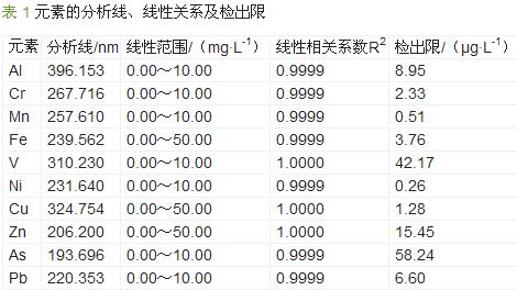 印染廢水是以加工棉、麻、化學纖維及其混紡產(chǎn)品為主的印染廠排出的廢水,具有水量大、有機污染物含量高、堿性大、水質(zhì)變化大等特點,而且均不同程度上含有一定量的重金屬元素。我國對印染廢水中重金屬元素的排放有嚴格規(guī)定,因此準確測定印染廢水中的重金屬元素含量具有重要意義。目前印染廢水中重金屬元素的測定方法主要有光度法、原子吸收光譜法和伏安法等。由于印染廢水本身帶有顏色,采用光度法測定會帶來較大的誤差;原子吸收光譜則不能進行多組分或多元素分析,費時費力;伏安法操作方便,但精密度偏低,準確度較差。而電感耦合等離子體發(fā)射光譜法(ICP-OES)因具有靈敏度高、檢出限低、干擾少、線性范圍寬等優(yōu)點,已在冶金、環(huán)境、食品、農(nóng)業(yè)等各行業(yè)得到廣泛應(yīng)用。