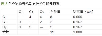 判斷矩陣(A)中的4個因素:在氮類物質(zhì)去除效果評價B1中,因原水氨氮較高,需要較高的去除率,且一般工藝去除率較低,故其重要性最高;有機(jī)物去除效果評價B2,經(jīng)本工藝去除后效果遠(yuǎn)優(yōu)于水質(zhì)標(biāo)準(zhǔn)要求,故其重要性較低;反應(yīng)器生物量評價B3因本工藝的重要優(yōu)勢在于能較好地發(fā)揮微生物降解作用,故其重要性較高;膜運行狀況評價B4因模擬試驗周期相對較短,相對而言其重要性較低,但在示范工程中應(yīng)重點考慮。判斷矩陣(B1)中的3個因素:出水氨氮C1是本工藝的主要控制指標(biāo),出水亞硝酸鹽氮C2和出水硝酸鹽氮C3僅在分析氮元素的相互轉(zhuǎn)化過程中作為參考,因此C1的重要性遠(yuǎn)高于C2和C3。判斷矩陣(B3&B4)中的3個因素:膜池混合液EPS濃度C6既作為膜池中生物量的重要表征指標(biāo),又是膜污染形成的重要原因,故將判斷矩陣B3和B4進(jìn)行綜合考慮;膜池內(nèi)總磷C5作為池中生物量和生物活性的重要表征指標(biāo),與C6重要性相當(dāng);跨膜壓差C7作為評價膜污染的直觀指標(biāo),因試驗周期較短,因此表現(xiàn)并不特別明顯,其重要性較低。