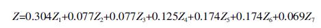 運用MATLAB軟件,按照一致性檢驗的計算公式及方法計算,得到各判斷矩陣A、B1、B3&B4的一致性指標(biāo)均<0.1,即判斷矩陣的一致性均可以接受,各權(quán)重的分配是合理的。將分析計算得到的各指標(biāo)權(quán)重分配wi(wi=wBi×wCi)和隸屬度評分Zi代入式(1)中,得到計算綜合評價指標(biāo)Z的具體化公式: