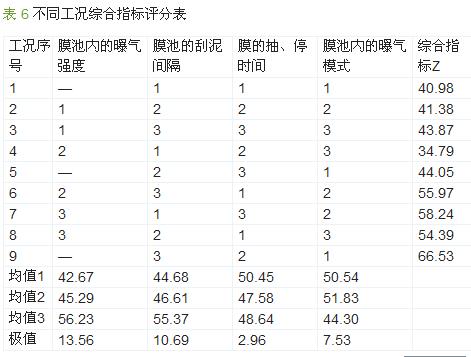 將計算得到的隸屬度評分Zi代入式(2)中,得到9個工況的綜合評價指標(biāo)Z,最終得到綜合指標(biāo)評分,列入表6中。采用極差分析法對運行工況的各因素進(jìn)行分析比較,結(jié)果表明,各因素作用的重要程度為:膜池內(nèi)的曝氣強(qiáng)度>膜池的刮泥間隔>膜池內(nèi)的曝氣模式>膜的抽、停時間。膜池內(nèi)的曝氣強(qiáng)度應(yīng)在設(shè)計過程中重點考慮,適當(dāng)?shù)钠貧饪蔀榛钚晕勰辔⑸锾峁┥L必需的氧氣,而且可使泥水混合物充分混合,對于延緩膜池中膜污染有一定的作用;曝氣量過小則難以實現(xiàn)上述作用;曝氣量過大不僅增加能耗,還可能影響混合液的性狀,考慮到實際給水系統(tǒng)污泥濃度較低,故采用較污水處理系統(tǒng)氣水比經(jīng)驗值低的氣水比值。膜池內(nèi)的曝氣模式和膜池的刮泥間隔也應(yīng)在設(shè)計中予以考慮,合適的膜池內(nèi)曝氣方式有利于膜池中活性污泥微生物的形成和膜污染的控制,選擇合適的刮泥間隔,能夠以排泥和補(bǔ)投新炭的方式保持系統(tǒng)的正常運行。膜的抽、停時間由進(jìn)出水量決定,分析結(jié)果表明對于不同的設(shè)計參數(shù)影響不大,應(yīng)結(jié)合抽吸泵運行管理綜合確定。