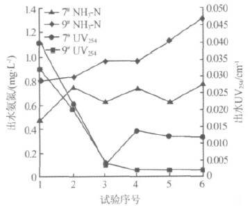 由表6可知,工況7和工況9的綜合指標(biāo)Z值較其他工況要高,分別為58.24和66.53,為備選的較優(yōu)工況。在實際運行過程中,出水水質(zhì)是檢驗工況合理性的最直接和最重要因素,其中出水氨氮和UV254為主要檢測指標(biāo),工況對其去除效果和出水穩(wěn)定性的影響最為重要。對工況7和工況9運行過程中的出水氨氮和UV254進(jìn)行監(jiān)測,見圖3。