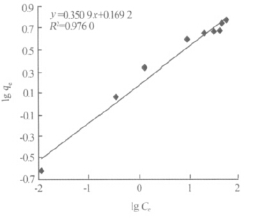 在吸附平衡研究中,描述吸附等溫線最常用的表達(dá)式是Freundlich方程和Langmuir方程。Freundlich方程是表征多層吸附的經(jīng)驗(yàn)式,其吸附等溫模型如圖2所示。一般認(rèn)為,F(xiàn)reundlich等溫式的特征參數(shù)1/n介于0.1~0.5時(shí)容易吸附〔11〕。其線性化形式為:
