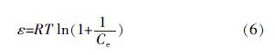 吸附機(jī)理研究采用D-R(Dubinin-Radushkevich)吸附等溫模型(見圖4),該模型沒有單層、均質(zhì)吸附的假設(shè)〔13〕,可用于區(qū)分物理吸附和化學(xué)吸附。D-R吸附等溫模型的線性表達(dá)式: