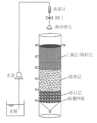 為了綜合發(fā)揮各基質(zhì)優(yōu)勢(shì),潛流濕地床往往由多種基質(zhì)組成。一般來(lái)說(shuō),基質(zhì)比表面積越大,污水與基質(zhì)的接觸面積越大,凈化效率也會(huì)相對(duì)增加〔4〕。傳統(tǒng)人工濕地的基質(zhì)采用土壤、砂、礫石等,雒維國(guó)等〔5〕對(duì)比了土壤、礫石、煤渣對(duì)NH4+-N的吸附效果,結(jié)果表明,在基質(zhì)未達(dá)到吸附飽和度之前,煤渣的脫氮效果最好。而陶粒是目前研究較多的新型基質(zhì),具有較大的比表面積,質(zhì)輕多孔。因此本實(shí)驗(yàn)基質(zhì)選擇礫石、土壤、陶粒、煤渣進(jìn)行組合,其中煤渣粒徑在2~5mm,陶粒粒徑10mm,下層以礫石做承托層,高度15cm,中間填充煤渣,高度30cm,上層對(duì)土壤和陶粒的去除污染物能力進(jìn)行對(duì)比,高度30cm。