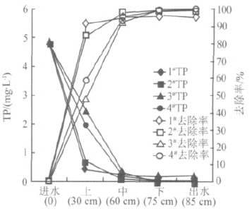 實(shí)驗(yàn)結(jié)果表明,4組裝置對(duì)TP的去除主要發(fā)生在上層和中層。