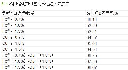 從表1可以看出,由于負(fù)載金屬離子的種類和負(fù)載量不同,酸性紅B的降解效果差異很大,降解率在51%~98%之間。其中負(fù)載Fe3+的催化劑催化效果較差;負(fù)載Cu2+的效果優(yōu)于負(fù)載Fe3+;而負(fù)載鐵銅雙金屬離子的催化劑降解率在96.67%~97.33%,催化效果最好。當(dāng)Fe3+、Cu2+負(fù)載量由0.7%增加到1.0%時,降解率均有提高,此后繼續(xù)增加金屬離子負(fù)載量,降解率不再發(fā)生明顯變化。分析其原因,活性炭上可供金屬離子負(fù)載的活性位數(shù)量是一定的,當(dāng)金屬離子負(fù)載量較少時,還存在多余的活性位,此時增加負(fù)載量可以提高催化效果;而當(dāng)活性位均被占據(jù)后,金屬離子負(fù)載達到飽和,再增加金屬離子也不能提高催化效果。在Fe3+-Cu2+負(fù)載雙金屬催化劑中,固定Cu2+負(fù)載量為1.0%,當(dāng)Fe3+負(fù)載量在0.7%~1.5%范圍內(nèi)變化時沒有引起降解率的顯著差異,降解率在96.67%~97.33%,說明在Fe3+-Cu2+催化劑中起到主要催化作用的是Cu2+。由以上分析可知,F(xiàn)e3+-Cu2+型催化劑的催化性能最好,其適宜的Fe3+、Cu2+負(fù)載量均為1.0%。