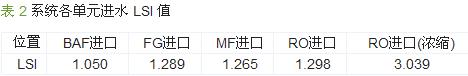 依據(jù)表1中系統(tǒng)各單元進(jìn)水水質(zhì)參數(shù)計算所得系統(tǒng)各單元進(jìn)水的LSI見表2。