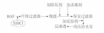 調(diào)整后原有流程及操作條件基本保持不變,在BAF出口增加一加酸點(diǎn),投加HCl,調(diào)整pH至6.0~7.5,以防止LSI過大而結(jié)垢,而且增加了殺菌劑HClO在保安過濾器進(jìn)水中的投加量。