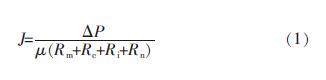 膜過濾原水時產(chǎn)生的阻力是由多種阻力造成的。過濾通量與各個阻力的關(guān)系可以通過式(1)表示。