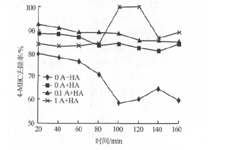 圖2直觀說明了膜對4-MBC的吸附作用,以及腐殖酸和電場對去除率的影響。