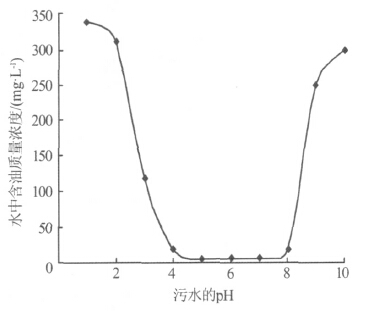 由圖 3 可以看出,水體pH 對CJ-1 絮凝效果影響顯著,存在適宜的絮凝pH 范圍,即pH 為4~8,當 pH 在5 ~7 范圍時絮凝效果最好,除油率達到 99.1%。當pH<4,或pH>8 時,除油率均下降。究其原因可能是,pH 近中性的水體有利于CJ-1 和Fe2+螯合反應,形成帶正電荷的大分子網(wǎng)狀結構絮體,通過靜電作用與表面帶負電荷的油珠發(fā)生作用而聚結,加上大分子鏈的卷掃作用,使其除油和懸浮物的能力得到加強,絮體包裹油珠沉入水體下層,實現(xiàn)油水分離,獲得優(yōu)良除油效果。當pH 過低時,水體中過多的H+會吸附在油珠表面,使油珠表面反而帶上正電荷,表面帶正電荷的油珠與CJ-1 和Fe2+螯合反應形成的帶正電荷的大分子網(wǎng)狀結構絮體之間的靜電排斥,產(chǎn)生聚結阻礙,僅靠大分子鏈的卷掃作用除油和懸浮物的能力必然下降,因此除油效果不好。當 pH 過高時,F(xiàn)e2+容易被氧化為Fe3+,同時也促成鐵離子水解,CJ-1 便不能與Fe2+形成有效組合,也就不能起到絮凝作用〔8, 9, 10〕。因此,CJ-1 與Fe2+組合適合近中性含油污水處理,現(xiàn)場油田污水pH 一般處中性范圍,因此適合于現(xiàn)場應用。