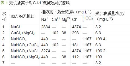 油田污水中一般含有大量的Na+、Ca2+、Mg2+、 Cl-、HCO3-等無機鹽離子,礦化度高達數(shù)千甚至幾萬 mg/L。為了探明油田污水中常見無機鹽離子對CJ-1 絮凝性能的影響,實驗按照1.1 所述方法考察了 CJ-1 對添加有不同無機鹽的模擬油田污水的除油效果,實驗結果見表 1。
