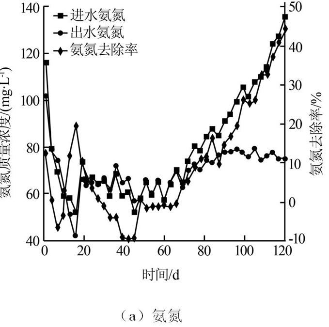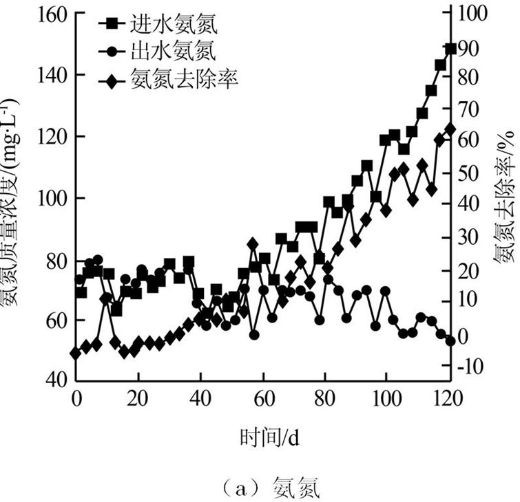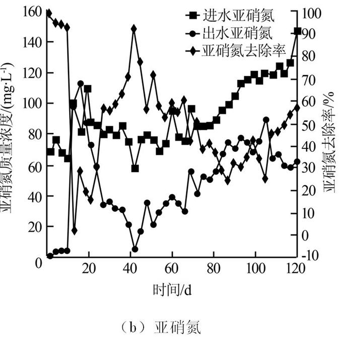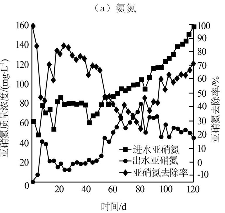 實(shí)驗(yàn)過程分為兩個(gè)階段,即污泥適應(yīng)期和污泥活性提升期。在污泥適應(yīng)期,進(jìn)水氨氮與亞硝氮質(zhì)量濃度控制為50~80 mg/L,水力停留時(shí)間為3 d;當(dāng)出現(xiàn)厭氧氨氧化現(xiàn)象后進(jìn)入污泥活性提升期,在污泥活性提升期,進(jìn)水氨氮與亞硝氮質(zhì)量濃度控制為80~150 mg/L左右,水力停留時(shí)間為3 d。定期檢測(cè)出水氮素的濃度,分析氮素去除情況,并每隔1個(gè)月檢測(cè)污泥粒徑的變化。