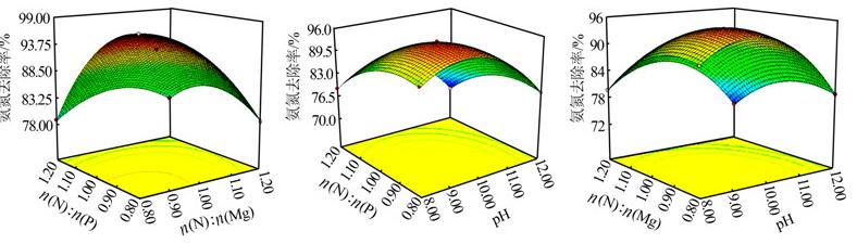 (1)響應(yīng)面法能夠準確地分析和預測pH、n(N)∶n(Mg)和n(N)∶n(P)對脫氨氮效果的影響,3個因素中只有n(N)∶n(Mg)和n(N)∶n(P)之間存在交互作用。