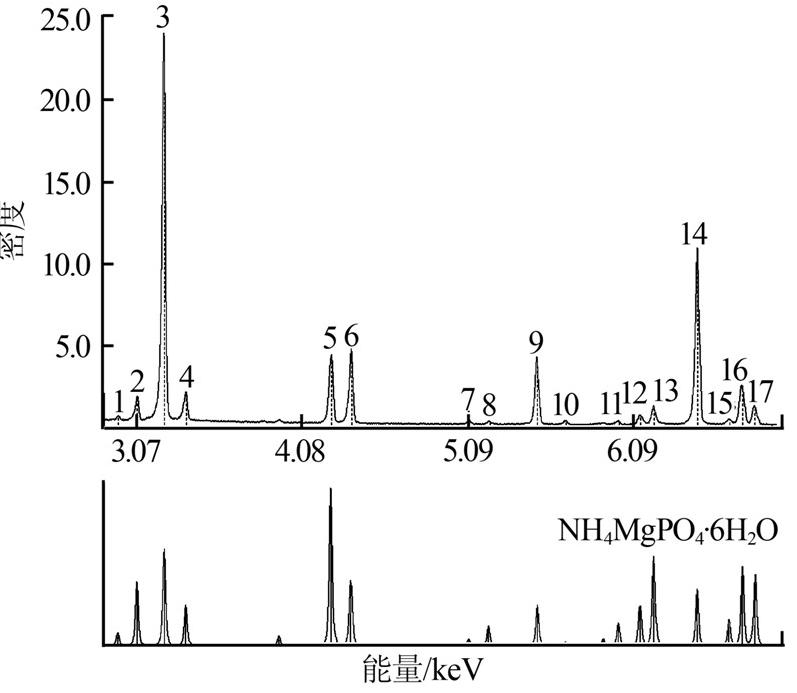 由圖 3可以看出,沉淀物的形狀較為規(guī)則,具有斜方晶形的特點,且結(jié)構(gòu)緊密,與MgNH4PO4·6H2O的晶體結(jié)構(gòu)相近。由圖 4可以看出,沉淀物的特征峰與MgNH4PO4·6H2O的標準PDF圖譜基本吻合,因此可以進一步確定該沉淀物的主要成分為鳥糞石。具體參見http://wlmqsb.com更多相關(guān)技術(shù)文檔。