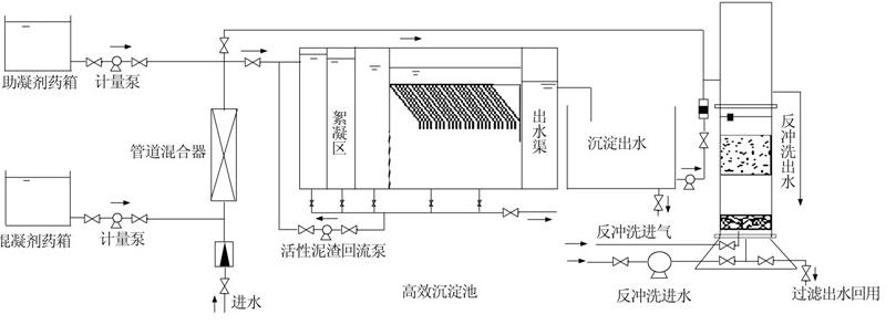 該工藝主要處理單元包括高效沉淀池、回流系統(tǒng)和過濾裝置。其中,高效沉淀池沉淀區(qū)中加裝了小間距豎向斜向組合板構(gòu)件,其網(wǎng)格式絮凝反應(yīng)區(qū)分為14格;沉淀區(qū)斜板間距25 mm,斜板長800 mm,水平傾角60度,在斜板下垂直延長250 mm.過濾裝置濾柱內(nèi)徑為250 mm,高為4 500 mm;濾層采用雙層濾料,上層為無煙煤,粒徑1.0~2.0 mm,高400 mm,下層為石英砂,粒徑0.5~1.2 mm,高500 mm;承托層厚400 mm,從下到上由粗到細鋪不同粒徑的卵石。