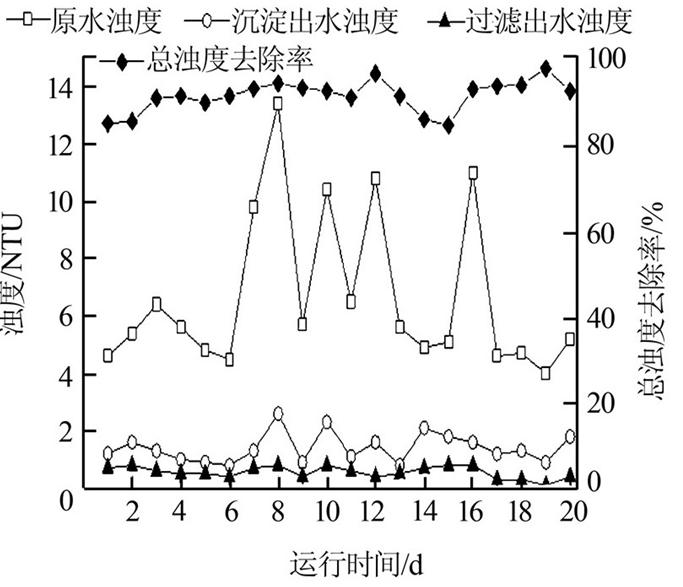 進水流量為1 m3/h;混凝劑采用聚合氯化鋁(PAC),投加量為30~40 mg/L;助凝劑采用陽離子PAM RT 2300,投加量為0.45 mg/L;絮凝時間為 13 min;沉淀池表面負荷為12 m3/(m2·h);濾柱濾速為10 m/h.當(dāng)原水濁度變化時,活性污泥回流量和混凝劑投加量隨之變化。