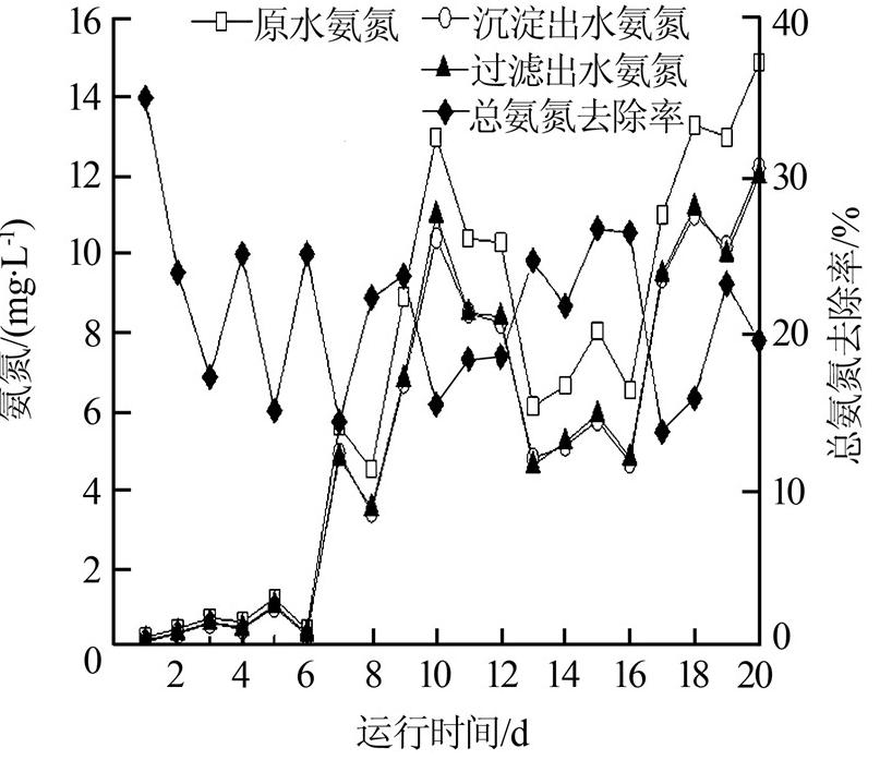 由圖 5可以看出,原水氨氮在開始階段比較低(<1 mg/L),此時出水氨氮<1 mg/L.當(dāng)原水氨氮為5~15 mg/L時,過濾出水氨氮在12 mg/L以下。系統(tǒng)總氨氮去除率平均僅為19.7%,說明該工藝對氨氮的去除并不理想。這是因為原水中的氨氮主要以離子態(tài)溶解于水中,用化學(xué)法去除氨氮沒有太大的作用,因此,混凝沉淀+過濾工藝很難將其去除〔9〕;但由于網(wǎng)捕卷掃作用也能夠去除一小部分含氮有機物,使工藝對氮也有一定的去除效果。同時,研究發(fā)現(xiàn)高效沉淀池出水經(jīng)過濾以后,其氨氮都有微小的上升趨勢。經(jīng)分析可能是由于濾柱中存在缺氧區(qū),在反硝化過程中發(fā)生同化反硝化,使一部分硝態(tài)氮轉(zhuǎn)化為氨態(tài)氮。