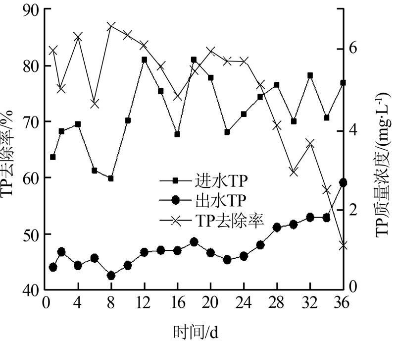 由圖 2可以看出,連續(xù)36 d不排泥,系統(tǒng)仍有處理效果,沒有發(fā)生出水磷濃度大于進水的情況,但除磷效果不是很穩(wěn)定,除磷率在48.00%~86.75%波動。系統(tǒng)運行第24天之前,出水磷質量濃度均小于1 mg/L,達到《城鎮(zhèn)污水處理廠污染物排放標準》一級B標準,平均去除率為80.67%,系統(tǒng)運行到第26天后,除磷效果逐漸變差,除磷率開始下降,到第36天時,出水磷質量濃度為2.68 mg/L,磷去除率為48.00%,由此可推斷,在系統(tǒng)不排泥的情況下,仍有除磷效果,但連續(xù)運行超過24 d后,除磷效果開始下降。這與傳統(tǒng)除磷理論認為泥齡越短除磷效果越好的說法不一致,因為厭氧/缺氧條件下生長的反硝化聚磷菌DPAOs比傳統(tǒng)聚磷菌PAO生長速率慢,所以其SRT比PAOs的長,這與石玉明等結論相同〔7, 8〕。