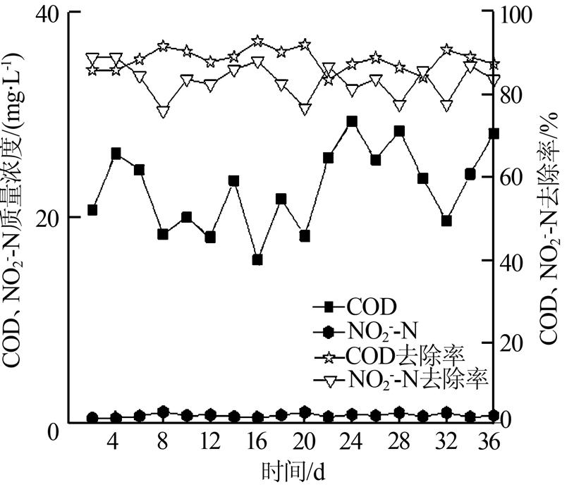 圖 3 無排泥系統(tǒng)COD、NO2--N去除效果