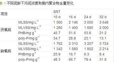 表 1是SRT為10、16、24、32 d的生物除磷反應器在不同泥齡條件下運行過程中,污泥濃度和胞內聚合物的含量變化情況。