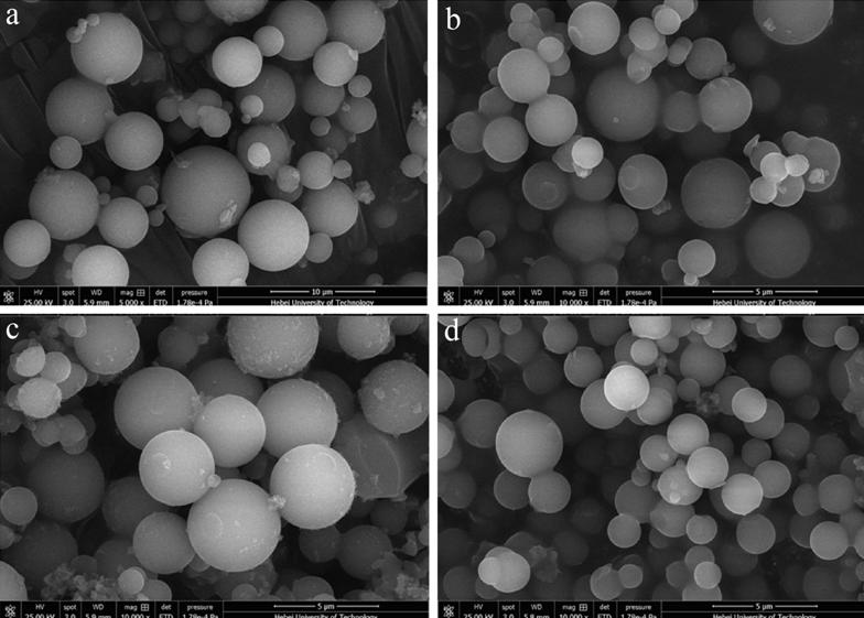 圖 4是在淀粉濃度為0.15 mol/L,水熱時間分別為8、12、20、24 h 條件下所制備碳球吸附銅離子后的SEM(依次對應圖 4上的a~d)。由圖 4可知,所制備的碳球呈球形,粒徑分別為0.70~1.70、2.0~5.0、1.0~4.0、0.35~0.55 μm,碳球粒徑隨著時間的延長先增加后減小,說明碳球在水熱8 h時已經(jīng)形成,但結(jié)構(gòu)不密實,12 h以后,繼續(xù)延長時間,碳球粒徑減小,碳球變得更加密實,但碳球表面羥基數(shù)量略微減少,因此,碳球?qū)饘匐x子的去除率先減小后趨于穩(wěn)定,這一結(jié)果與圖 2一致。