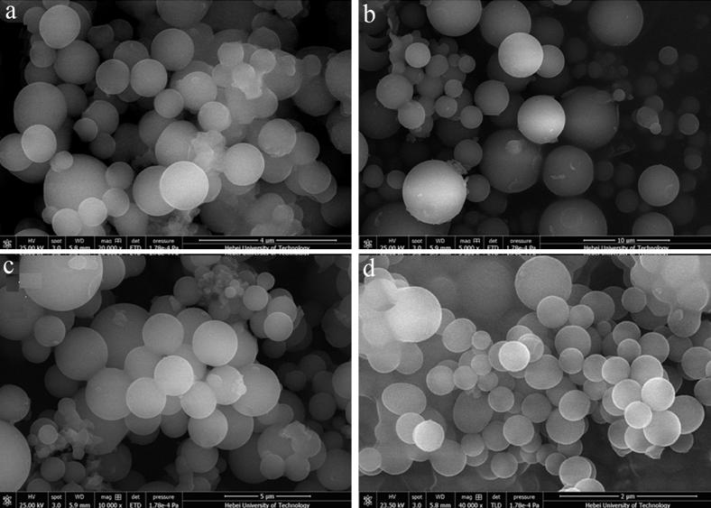 圖 3為在180 ℃水熱16 h條件下,淀粉溶液濃度分別為0.05、0.10、0.15、0.25 mol/L時所制備的碳球吸附銅離子后的SEM(依次對應圖 3上的a~d)。