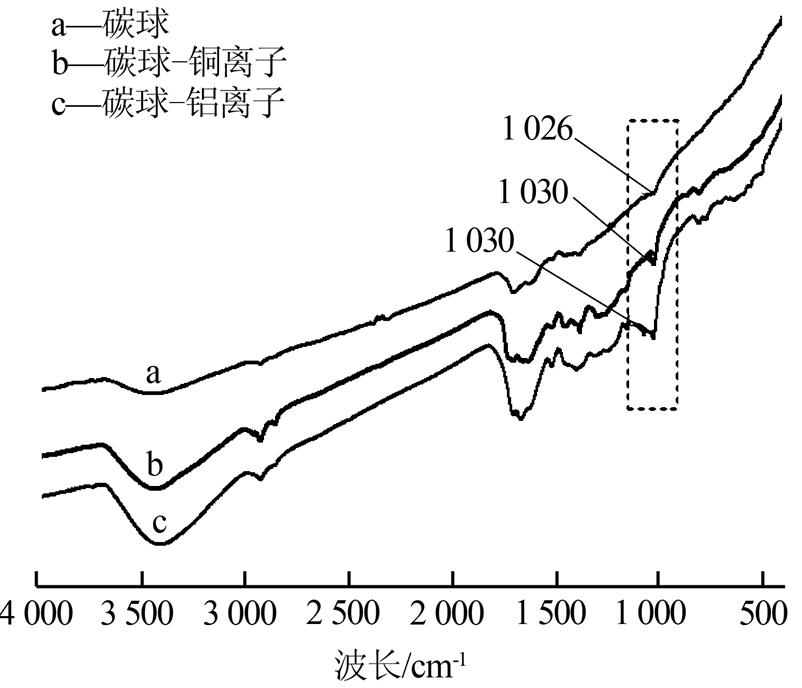 紅外光譜是證明吸附劑與吸附質(zhì)之間發(fā)生吸附作用的有效手段。圖 5為碳球和碳球吸附鉛離子或銅離子后的紅外光譜,通過比較,吸附金屬離子以后,碳球在1 026 cm-1波長處的吸收峰遷移到了 1 030 cm-1波長處,這是由于銅離子和鉛離子吸附在碳球表面所致,這與SEM結(jié)果一致。具體參見http://wlmqsb.com更多相關技術(shù)文檔。