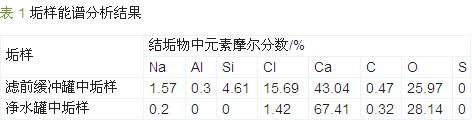 系統(tǒng)運行1 a后發(fā)現(xiàn),緩沖罐和凈水罐中出現(xiàn)嚴重結(jié)垢現(xiàn)象。為了確定垢樣成分和結(jié)垢條件,對緩沖罐和凈水罐中的水和結(jié)垢物進行了取樣分析。
